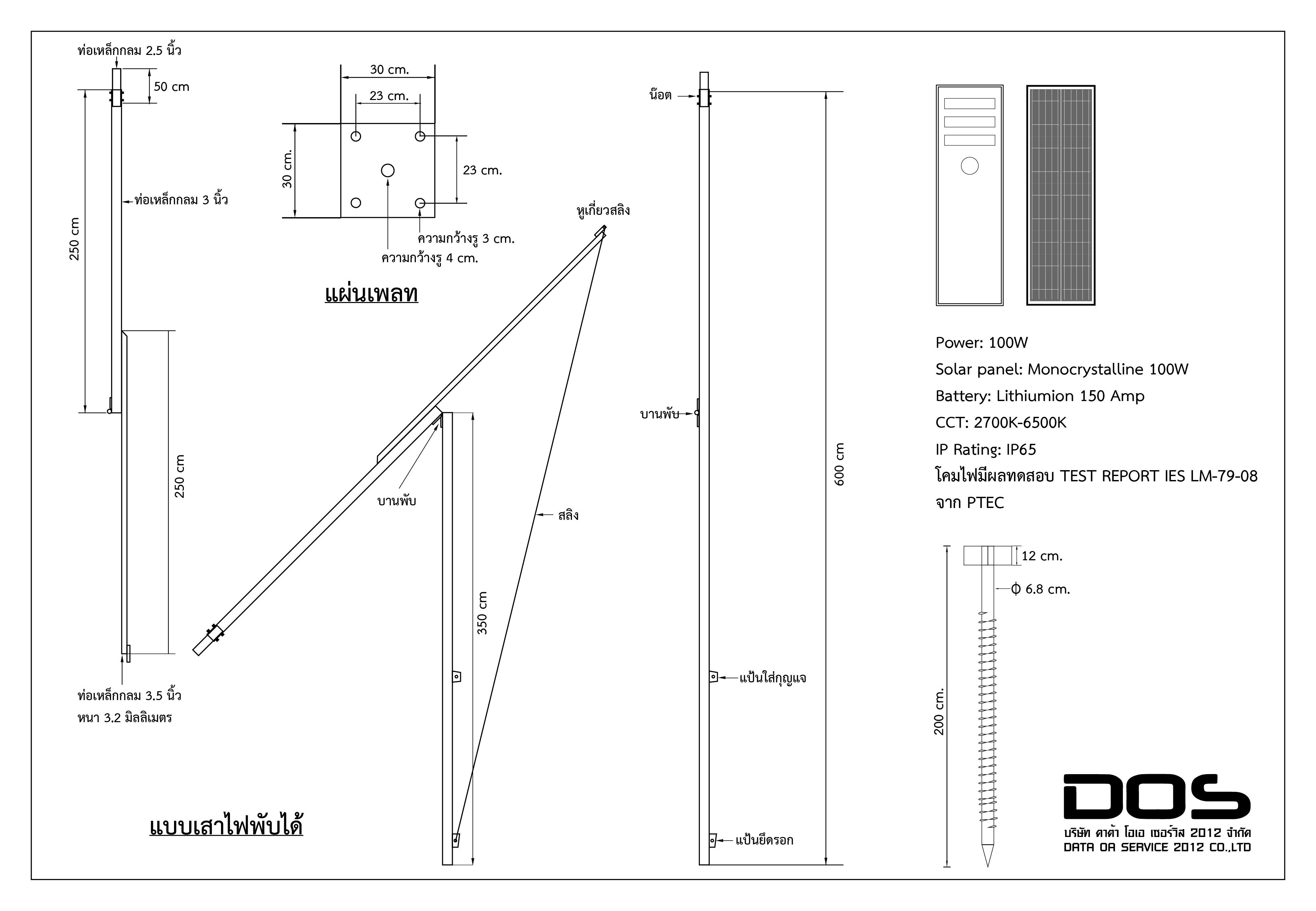 โคมไฟ All IN ONE LED- Power: 100W- Solar panel: Monocrystalline 100W- Battery: Lithium-ion 150 Amp- CCT: 2700K-6500K- IP Rating: IP65- โคมไฟ: มีผลทดสอบ TEST REPORT IES LM-79-08 จาก PTECเสาไฟ ยาว 6 เมตร ประกอบไปด้วย- ท่อเหล็กกลมขนาด 3 นิ้ว ยาว 250 เซนติเมตร